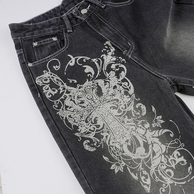 baggy jeans with a washed black base and bold distressed print detailing along both legs. made from mid-weight denim with a soft fade and a loose, relaxed silhouette.