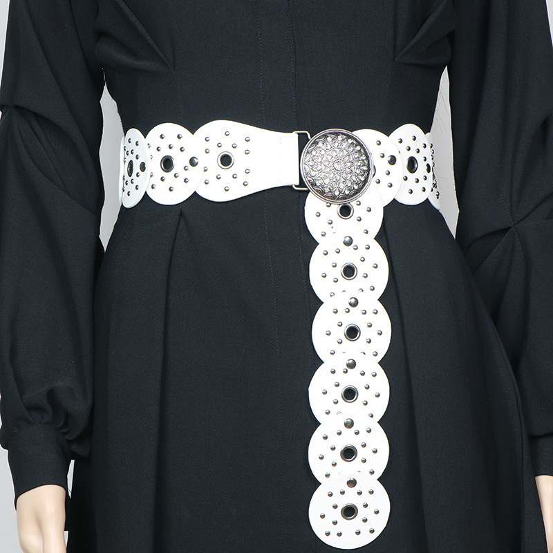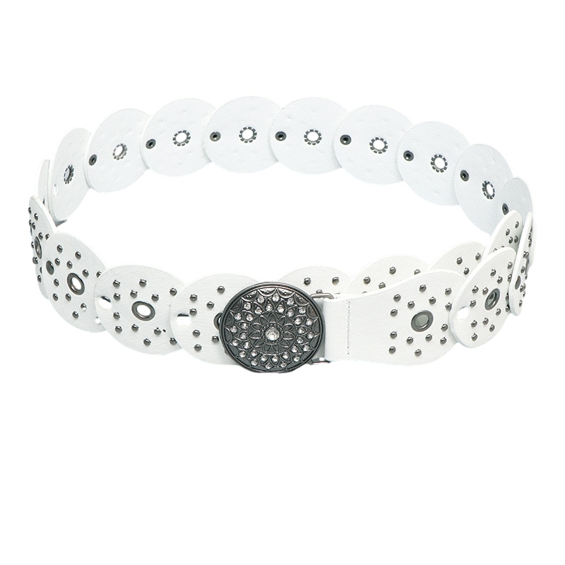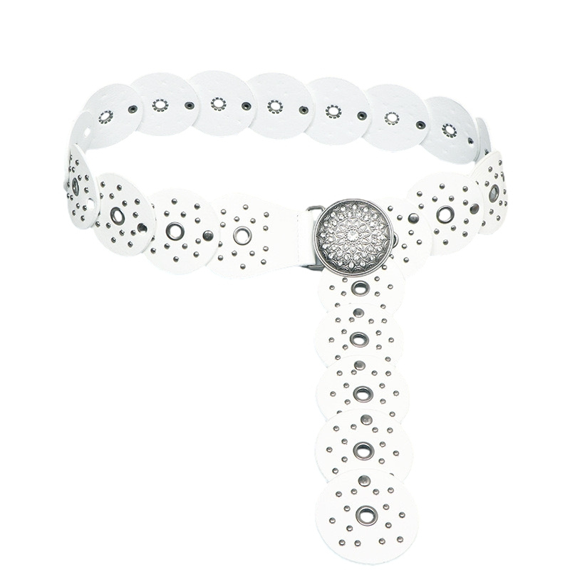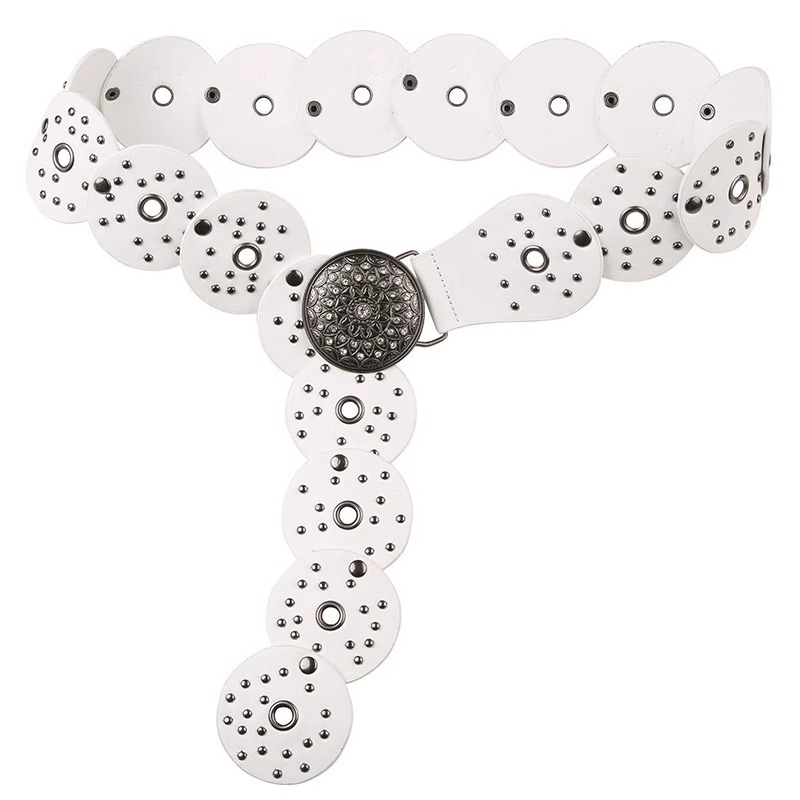 wide belt featuring circular cut-out panels with stud detailing and a bold embossed buckle.
